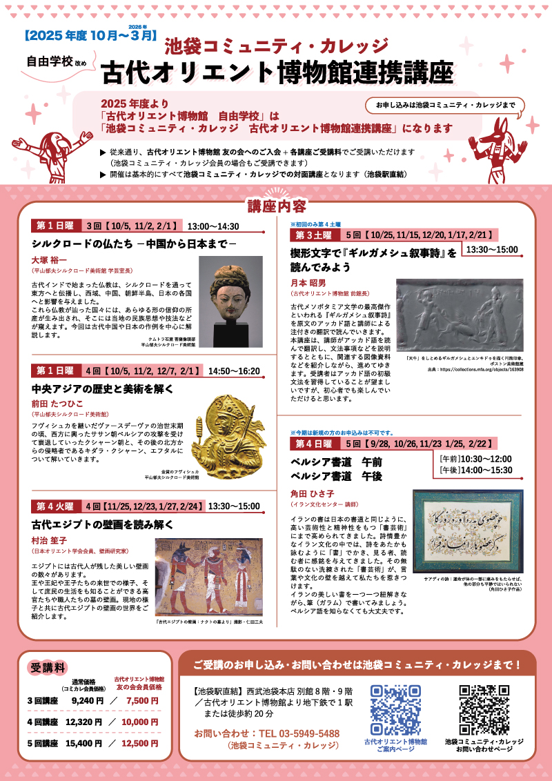 2025年度より、「古代オリエント博物館 自由学校」は「池袋コミュニティ・カレッジ 古代オリエント博物館連携講座」になります。